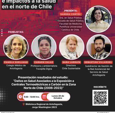 El próximo lunes 20 de Octubre, desde las 9:30 a 12:00 horas, en la Biblioteca Regional de Antofagasta (Jorge Washington 2623) se realizará la presentación de los resultados del estudio "Daños en salud asociados a la exposición a centrales termoeléctricas a carbón en la zona norte de Chile (2006-2023)".